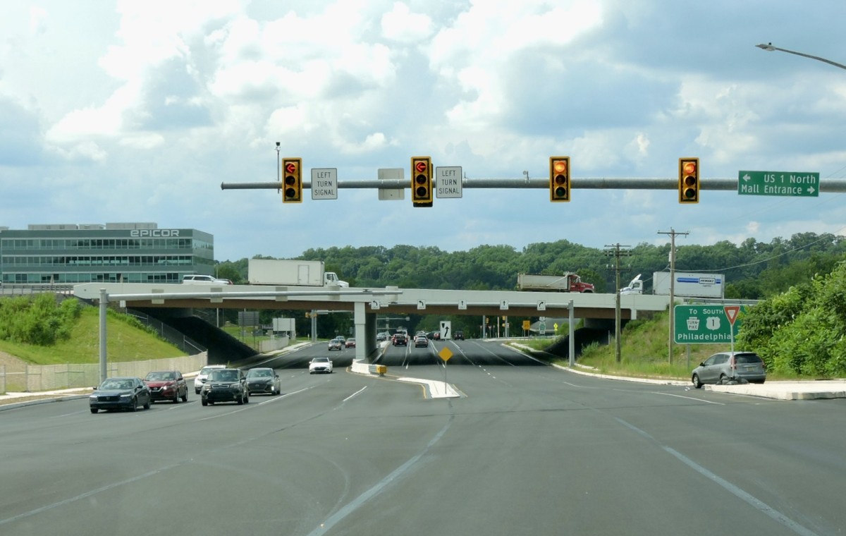 At Rockhill Drive (see below), turn lanes were added in both directions, and new sidewalks were constructed along both sides of the roadway. The on-ramp to U.S. 1 north was relocated to the southeastern quadrant of the interchange, and the off-ramps from U.S. 1 were widened to two lanes. The signalized intersection west of the Neshaminy Mall traffic signal was removed, and modifications were made to both remaining signalized intersections to improve traffic flow to and from the mall and the Horizon Corporate Center. The new sidewalks, ramps, and signals improve pedestrian accessibility and safety.