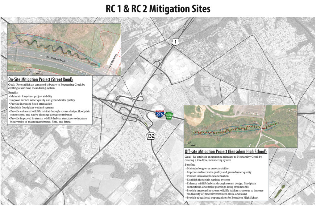 Project alternatives were identified and developed to avoid and minimize impacts to the wetlands and streams within the U.S. 1 project corridor, sections RC1 and RC2. Unavoidable impacts require mitigation through the replacement of wetland and stream resources. PennDOT identified two mitigation sites to offset impacts to wetlands and streams as a result of the U.S. 1, Sections RC1 and RC2 improvements. One On-site Mitigation area located off Street Road and one Off-site Mitigation site located at Bensalem High School.